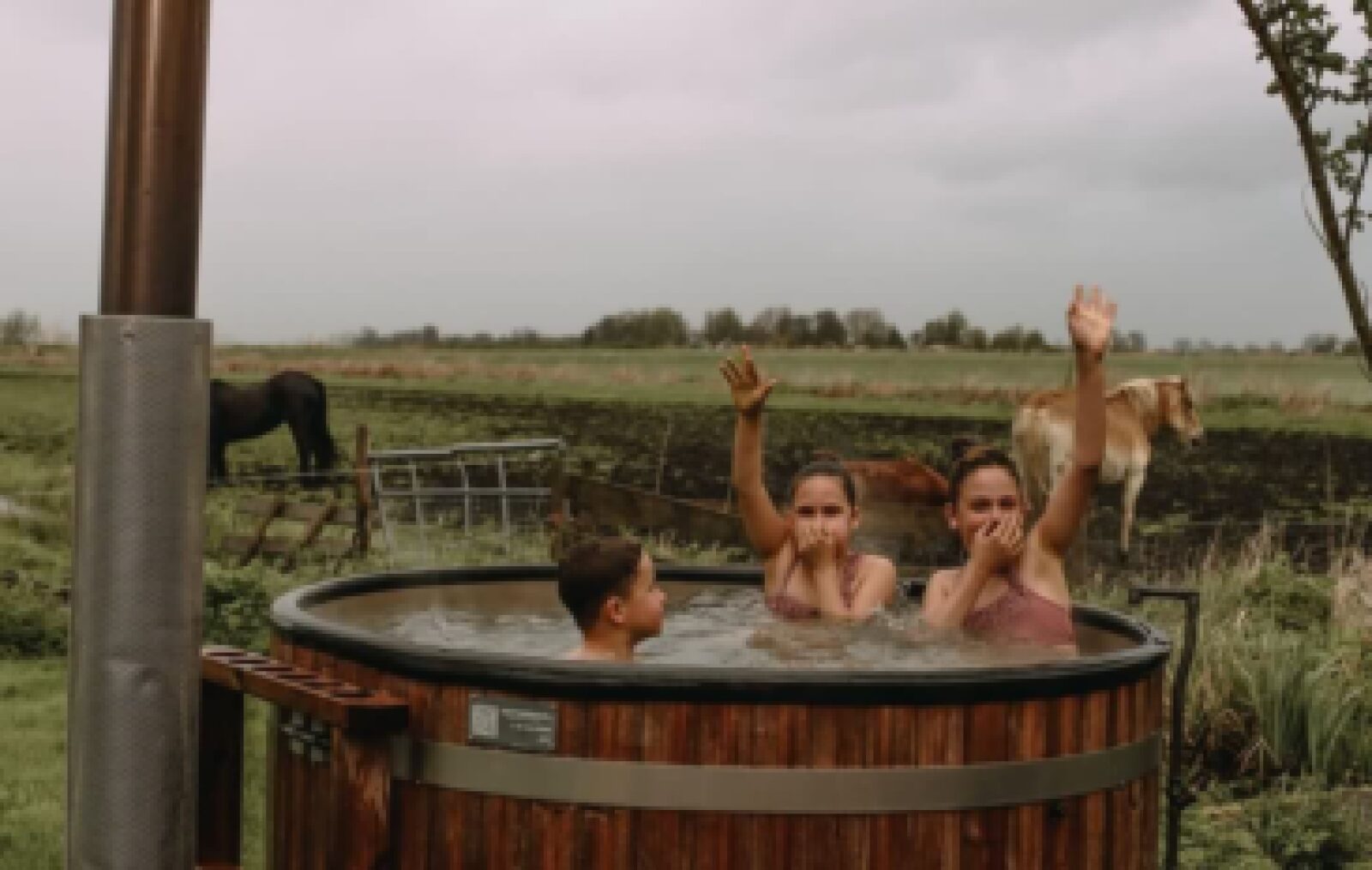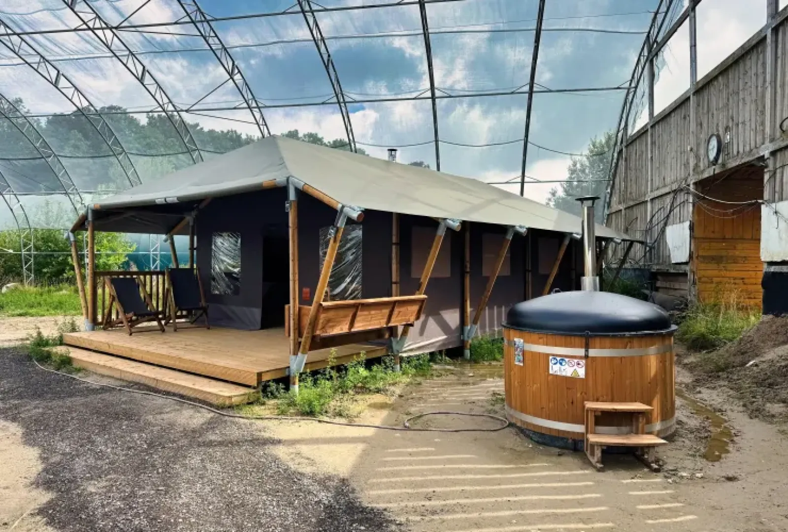 Under an elegant canopy, a retreat is created here where cozy get-togethers and living close to nature merge harmoniously. On almost 50 m² you will find a cozy seating area, a fully equipped kitchen with wood-burning stove and a spacious dining table for six people. The side walls can be opened wide and invite you to enjoy a refreshing summer breeze, while cozy niches invite you to relax. Three bedrooms - including a box bed and bunk beds - offer space for the whole family. The private outdoor shower with hot water, a real flush toilet and the wood-heated hot tub make your stay extra special. Thanks to natural temperature...