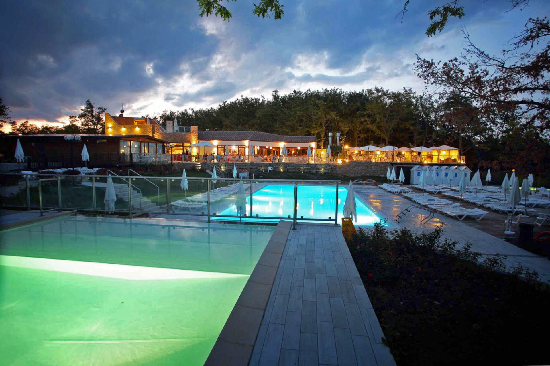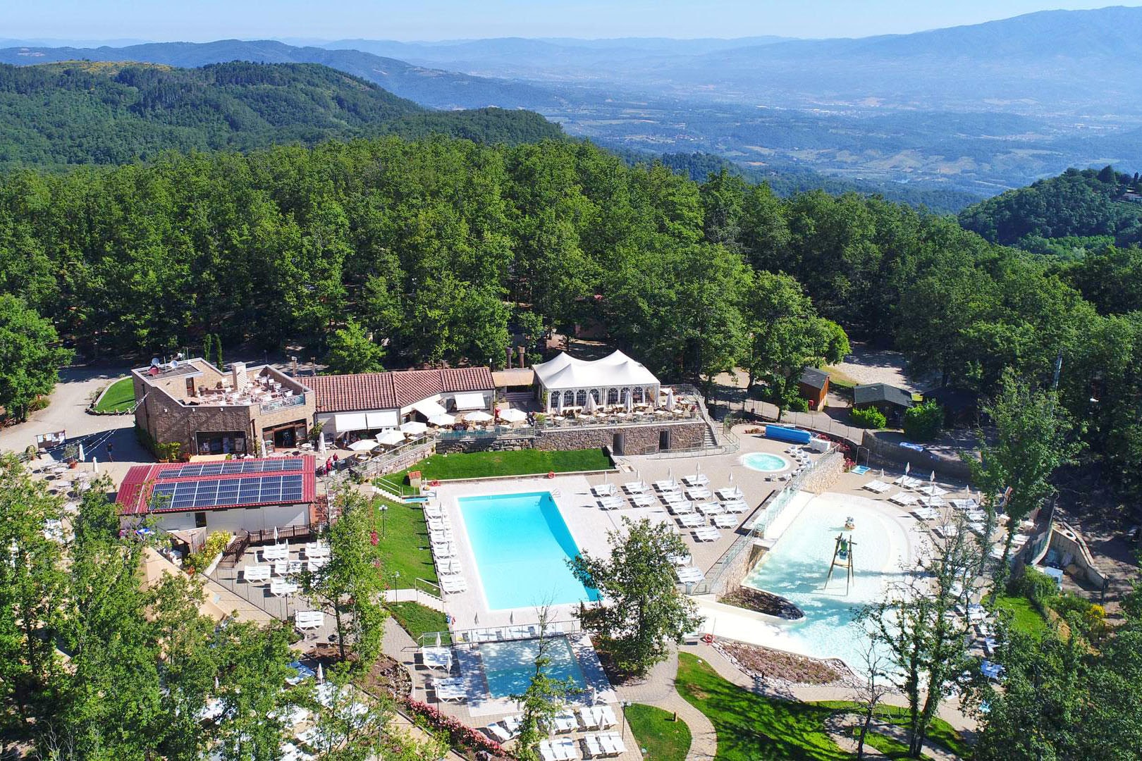 Swimming pleasure in a rural gem in Tuscany This wooded campsite in the rolling Chianti region offers everything that a good Italian life can offer. Orland in Chianti Glamping Resort is situated in the middle of the Tuscan countryside. The campsite has a lovely terrace for delicious meals and a fun water park for young and old. The campsite has plenty on offer for children, and you can really relax in the beautiful lodges and cottages. If you want a day out in one of the lovely towns, you can be in the ancient streets of Arezzo, Florence or Siena in less than an hour.   Charming campsite in the Chianti country The Chianti region is in the centre of the ‘boot of Italy’. This much-loved part of Tuscany is well-known for its picturesque landscapes, extensive vineyards and countless historic villages. The terraced Orlando in Chianti Glamping Resort in the province of Arezzo is tucked away among the idyllic hills and woods. This luxurious campsite comes into view at the end of winding roads with many bends and beautiful views.   Stylish swimming Be warned; you won’t get the children away from the lovely swimming pool complex. Wonderful swimming in the heated water, down the wide slide as many times as possible, then recover in the bubble bath. The attractive style of building with varying heights and deckchairs under the trees make this complex extra special. You can keep an eye on the water babies from the adjoining patio, which gives you a feeling of safety.   Energy for ten Spotty is the campsite’s happy mascot and will become the children’s idol in no time. The entertainment team are ready every day with tireless energy to draw, ride ponies or dance, but also for great musical shows in the evenings. And if you like exercising, take yourself to the swimming pool for an aqua-fit lesson or rent an e-bike or mountain bike and cycle round the surroundings of the campsite.   Get a taste of Tuscan cuisine Surely nothing is better than a good dinner with a famous Chianti? The restaurant is located slightly higher up which offers lovely views of the illuminated swimming pool from the terrace. Thanks to an extensive menu, connoisseurs of game can indulge themselves. As for fresh pizzas, they come straight out of the wood burning stove. Take a seat, because the tables are already set on this attractive terrace.   Medieval trips out If you want to explore in Italian style, rent a genuine Vespa at the campsite. You can make a great trip of only 8 km to the medieval town of Radda, with 12th century buildings with beautiful old facades. You won’t believe your eyes in the larger Tuscan towns either. The picturesque centre of Florence and the Piazza Grande in authentic Arezzo will make a big impression on you.