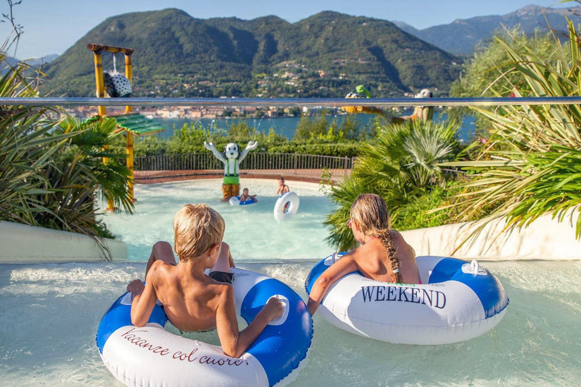 Plenty of playing and swimming at the lake Fun swimming pools and an adventure wood. Child-friendly in the extreme, with unique views of Lake Garda. Discover Lake Garda at its absolute best, with your entire family and in luxurious glamping accommodation. Weekend glamping Resort is pure heaven for small children. Swimming pools with slides, a full and creative entertainment programme, an adventure park, an indoor playground and a pizza and pasta restaurant make this campsite a children’s paradise. You get the panoramic views as a free gift! You can enjoy those while the children are going out or are lying in bed. A campsite with views of Lake Garda The picturesque bay at Salò is on the quieter western shore of Lake Garda. The old village is one of the loveliest places in the area. Weekend glamping Resort is located on the hill opposite, among old olive groves. You can reach Italy’s largest lake from the campsite on foot. The location is also ideal for many trips out. A Friday morning stroll around the farmers‘ market in Riva del Garda is highly recommended. The whole day in and around the swimming pool Swim a few lengths or just float around with views of the mountain tops while the children shoot down the water slide for the umpteenth time? The various swimming pools mean there is always a favourite place for everyone. There are fun water toys in the small toddlers‘ pool, such as colourful fountains. To dip your toes in the water of Lake Garda, take the footpath that goes 400 metres down from the campsite. Every day a party Young holidaymakers will have the time of their lives with the excellent entertainment team. They come up with something fun for the children every time. An hour of handicraft, baking pizzas, or a mini playback show, everything revolves around having fun together! Various pizzas and pastas are served at the restaurant. And… the view over the lake is never boring, especially when the lights come on. Luxurious patio Weekend glamping Resort has mostly luxurious accommodation. Each one of them on an attractive spot which is laid out in a parkland setting. What do you think of your own patio where you can take breakfast with views of the glistening water? You can also stay in the shade with your own tent, caravan or motorhome in the middle of the campsite among the olive trees. The toilet block is adjacent, but those who like extra comfort can book a pitch with private toilet facilities. Adventurous outdoor playground The best thing about this car-free campsite is the wonderful play area for the children. The Adventure Park is fantastic for climbing fanatics. There are climbing frames, slides and even a cable rope-way in the wood. Football enthusiasts can demonstrate their skills on the pitch which is 200 metres further on. The campsite also offers SUP lessons. And you can take your dog which can run around in the special training area in the woods. Go back in time Want to go out for an afternoon? There is always something nice to do around Lake Garda. Maybe step back in time with the children and walk together across the ancient drawbridge into Sirmione Castle. The enormous fort has 150 steps up to the top. Dare you? If later on you walk through the car-free centre, you will come across one ice cream parlour after the other. Mmm, delicious!