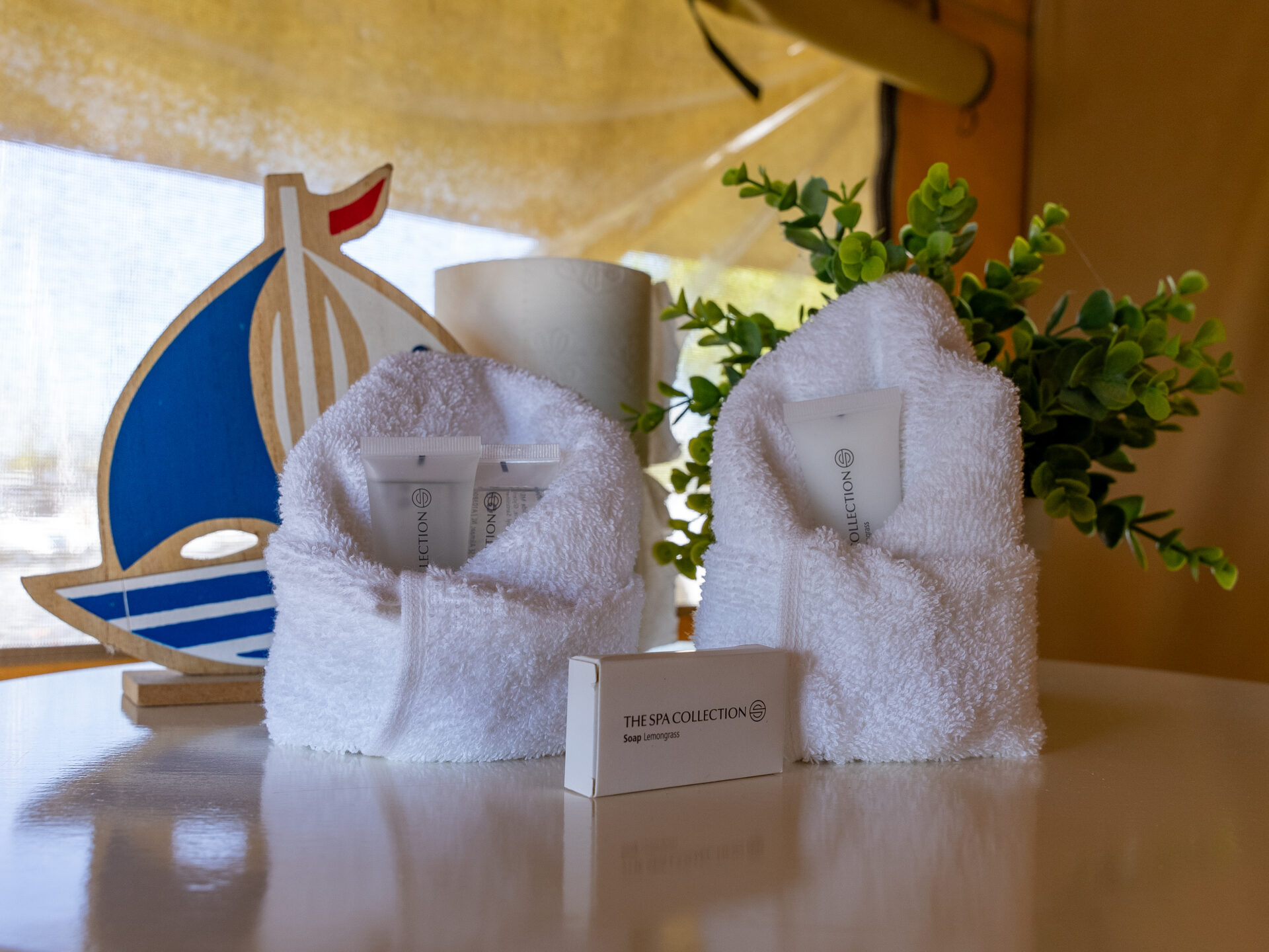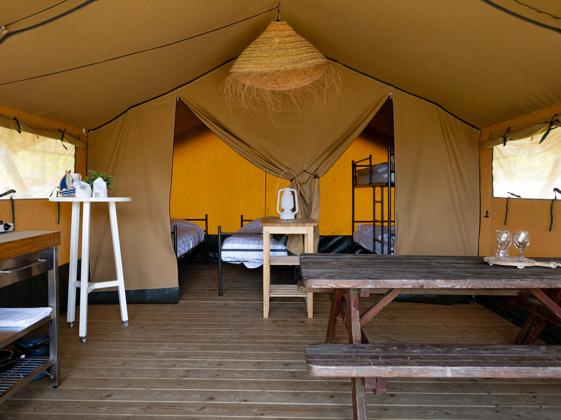 Notre tente safari offre tout le nécessaire pour un séjour relaxant. Avec deux chambres confortables, une cuisine entièrement équipée et des lits prêts à votre arrivée, installez-vous sans soucis. La terrasse privée avec mobilier d’extérieur est idéale pour profiter des environs. Les installations sanitaires partagées de la marina, bien entretenues, sont à votre disposition.