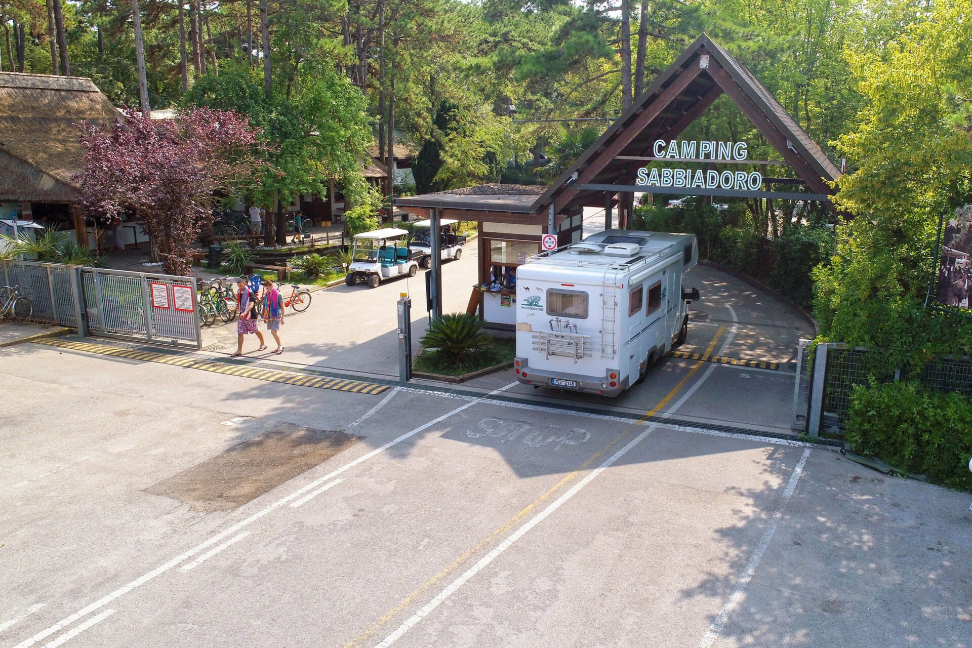 Top-Reiseziel an der nordadriatischen Küste An der Adriaküste zwischen Venedig und Triest befindet sich der 3-Sterne-Campingplatz Sabbiadoro. Dieser hundefreundliche Campingplatz eignet sich ideal für Familien und die Gäste, die ihre treuen Vierbeiner nicht zu Hause lassen möchten. Großartiger Wasserpark, toller Strand Der Campingplatz Sabbiadoro ist unter anderem mit einem Wasserpark mit drei Schwimmbädern, worunter ein Sprudelbad mit Rutsche, ein Kinderbad mit Rutsche (bei schlechtem Wetter überdacht und beheizt) und ein semi-olympisches Schwimmbad, sowie bequemen Liegen, Fitnessraum, Privatstrand, Sportgeräten (auch am Strand!), Fahrradverleih, Supermarkt und gratis WLAN ausgestattet und bietet Animation. Hundeliebhaber trainieren ihre Hunde an einem Geschicklichkeitsparcours. Viel zu erleben auf dem Campingplatz Am Strand können Sie Beachvolleyball spielen und unter anderem Liegestühle, Sonnenschirme, Kanus, Tretboote, Windsurfbretter und Stehpaddelbretter ausleihen. Trauen Sie sich, von der höchsten aufblasbaren Rutsche Europas zu rutschen? In Sabbiadoro können Sie es ausprobieren. Abends geht in der Arena des Campingplatzes bei abendfüllenden Programmen aus dem Bereich Kabarett, Musical, Sketches und anderen Auftritten die Post ab! Haben Sie Hunger? Gönnen Sie sich im nahe gelegenen Sabbiadoro Beach Bar and Restaurant einen leckeren Imbiss und Drinks bei Film und Musik oder besuchen Sie den erstklassigen Pizzabäcker des Campingplatzes. Sie möchten lieber am Strand reiten? Auch das ist kein Problem! Ausflüge zwischen Venedig und Triest Der Campingplatz ist nur einen Steinwurf vom Zentrum von Lignano Sabbiadoro entfernt. Hier erwartet Sie eine umfangreiche Auswahl an Restaurants, Bars, Geschäften und Eissalons und in der näheren Umgebung locken unzählige Freizeitparks. Die Weltstadt Venedig ist mit dem Auto, Zug oder Boot ebenso einfach erreichbar wie Triest mit dem imposanten Schloss Miramare.
