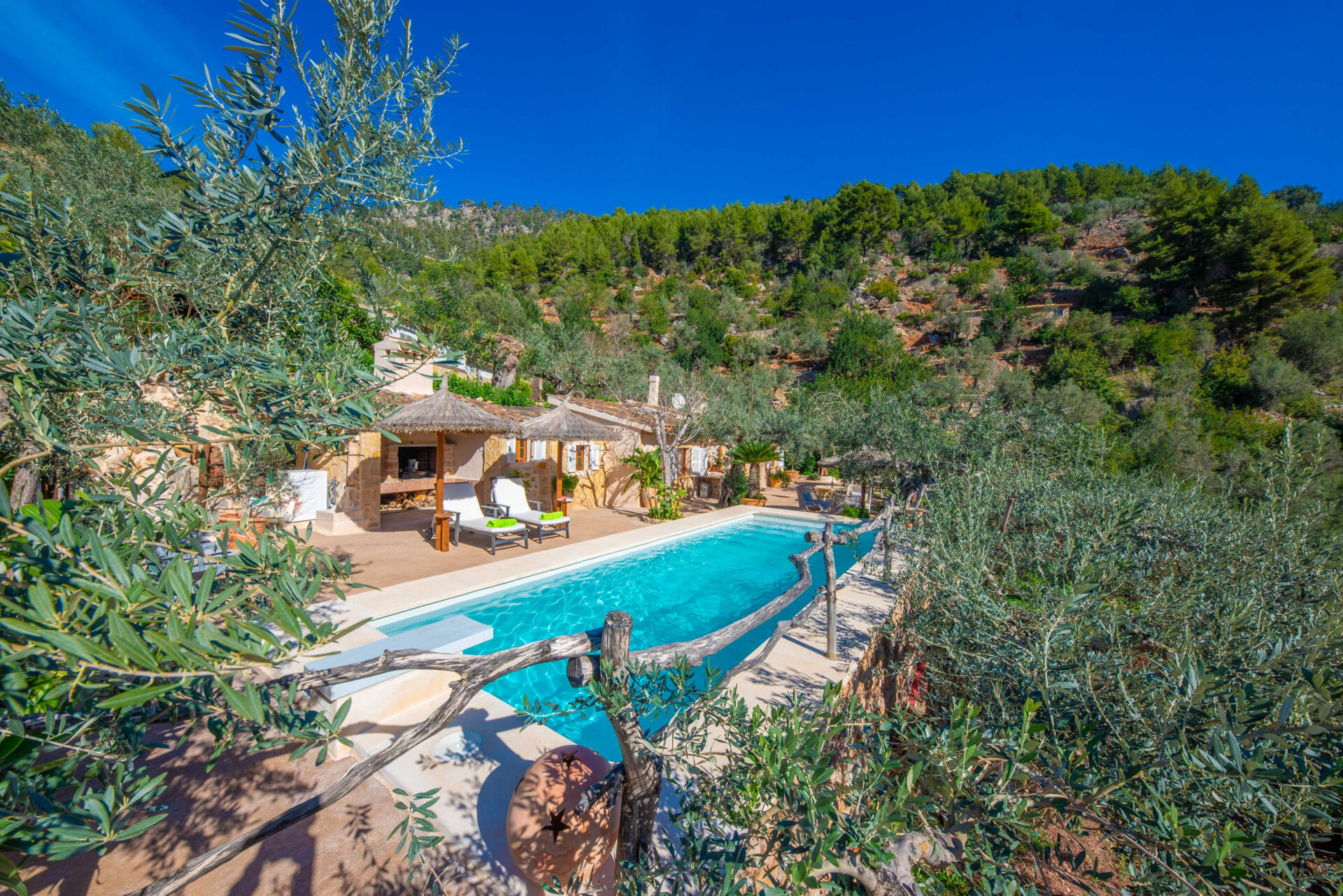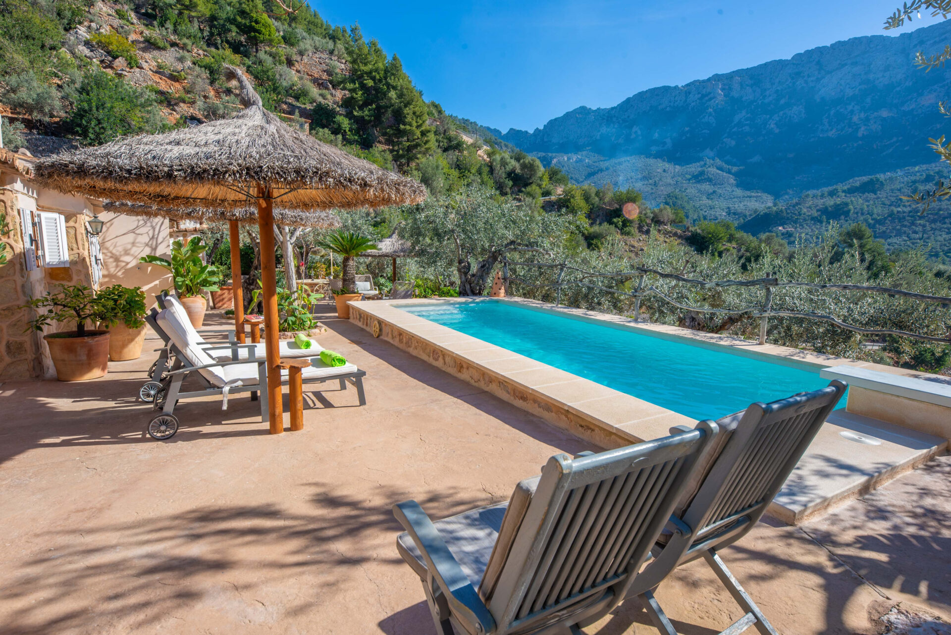 Die Außenanlagen sind wunderschön. Es gibt viele schöne Ecken, um zu grillen, ein Buch zu lesen oder zu entspannen. Das Besondere an diesem Haus ist der private, 8 x 3 m große Salzwasserpool mit einer Tiefe von 1,2 m bis 1,9 m, in dem man beim Schwimmen die fantastische Aussicht auf die Berge genießen kann.